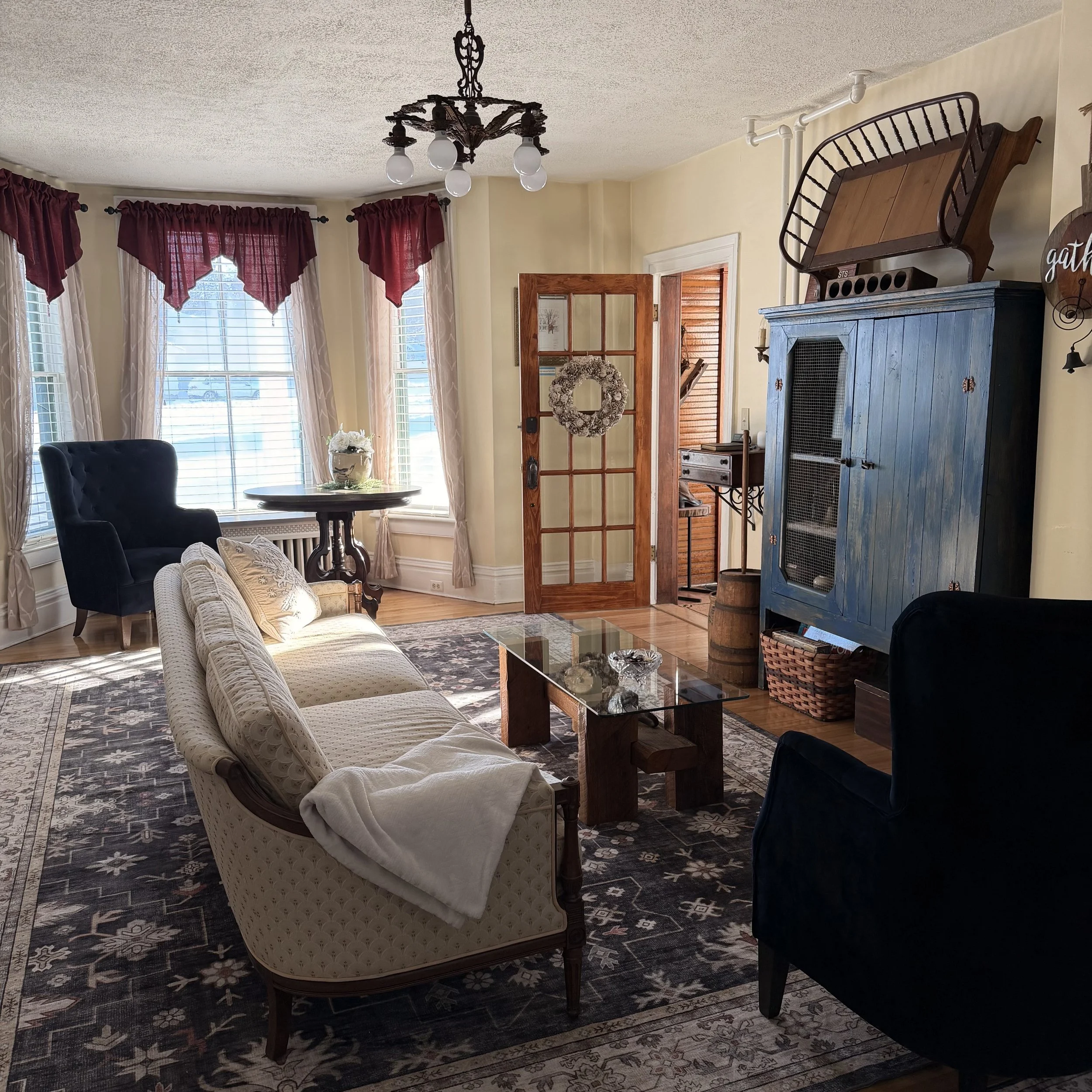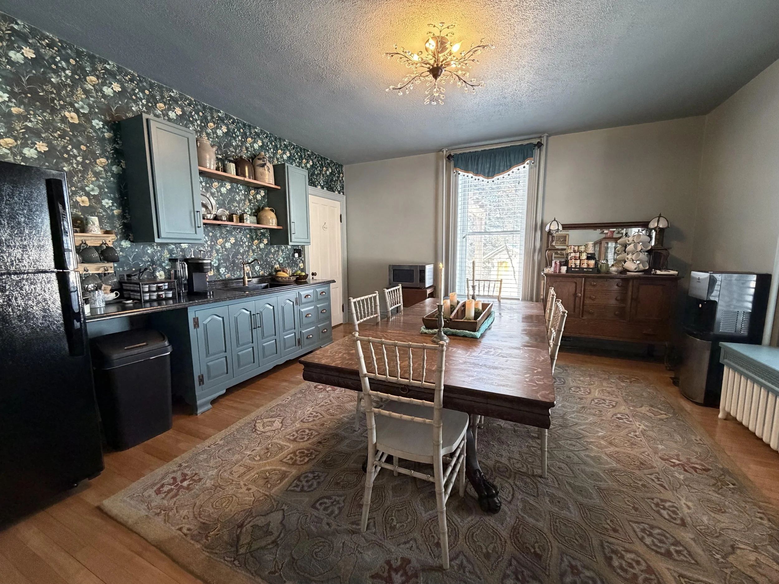 The dining room is thoughtfully equipped for family-style dining and features a full-sized refrigerator stocked with self-serve breakfast items, snacks and beverages. A kitchenette and microwave add convenience for extended stay guests. Coffee and tea are always available, day and night. Every detail has been designed to make guests feel comfortable and truly at home.